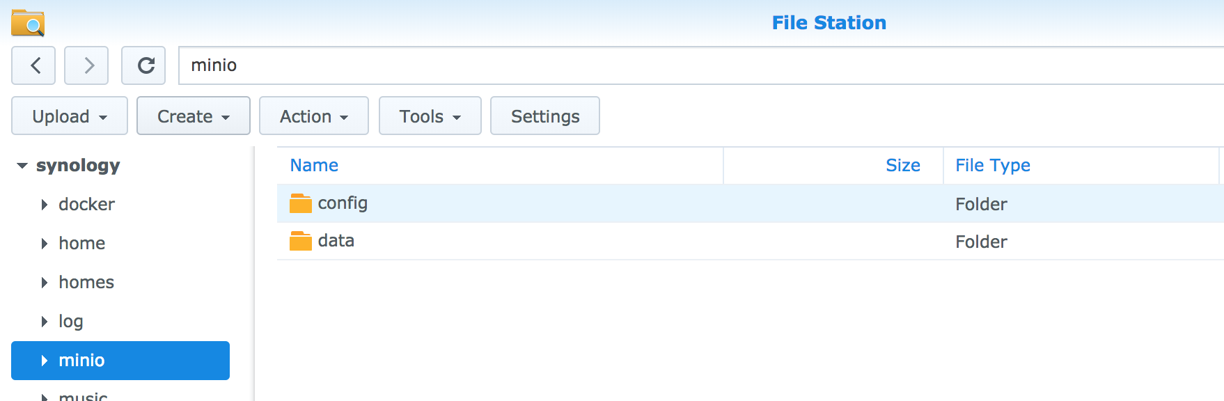 "File Station" => "minio"を選択 => "Create" => "Create folder"でdataを入力してフォルダ作成。同様にconfigを入力してフォルダ作成。