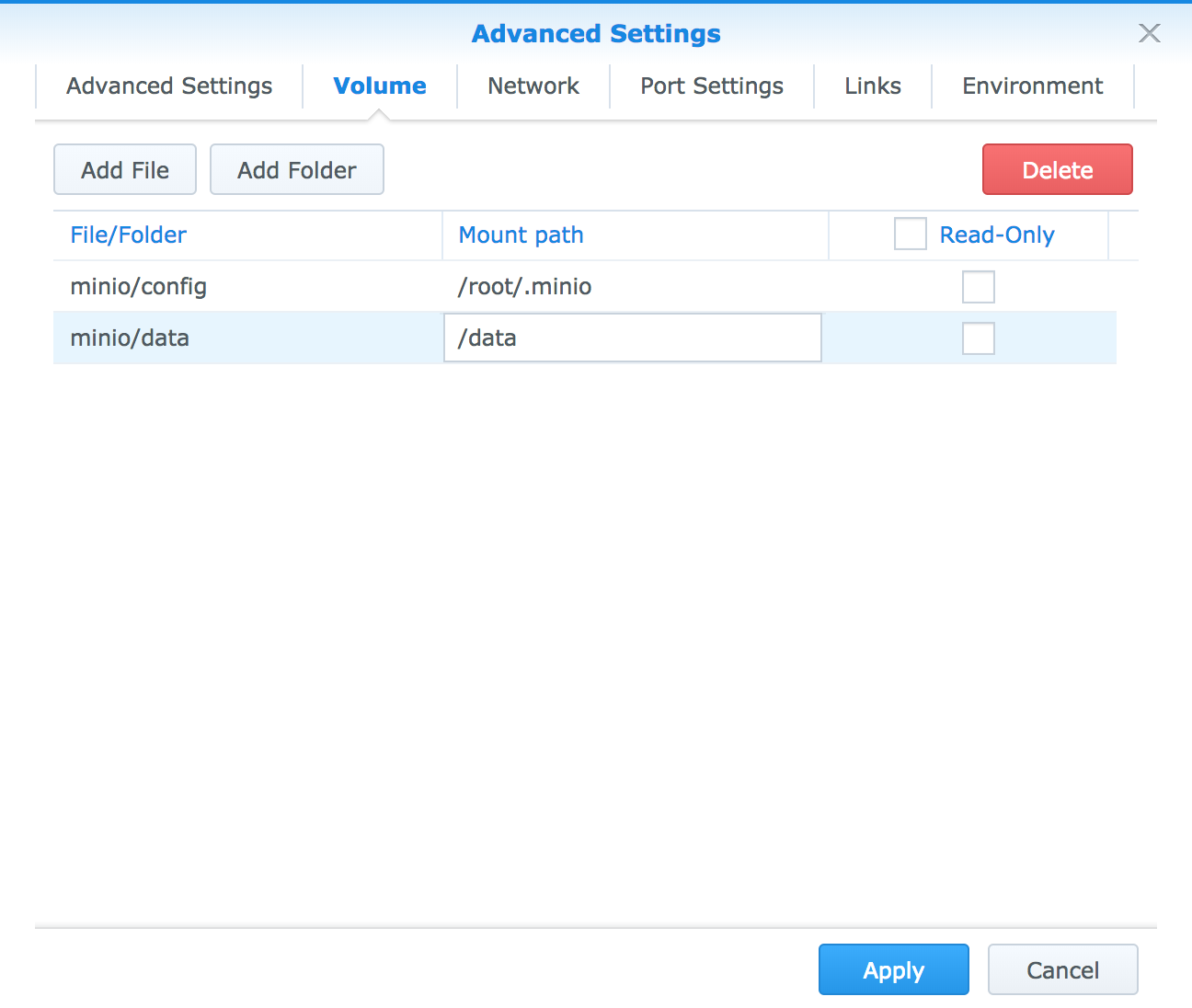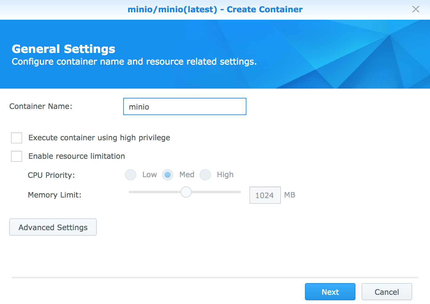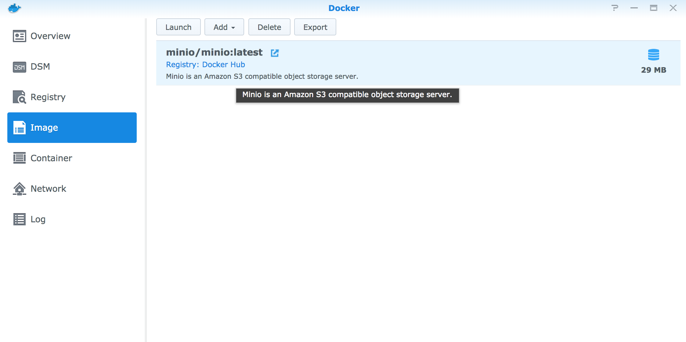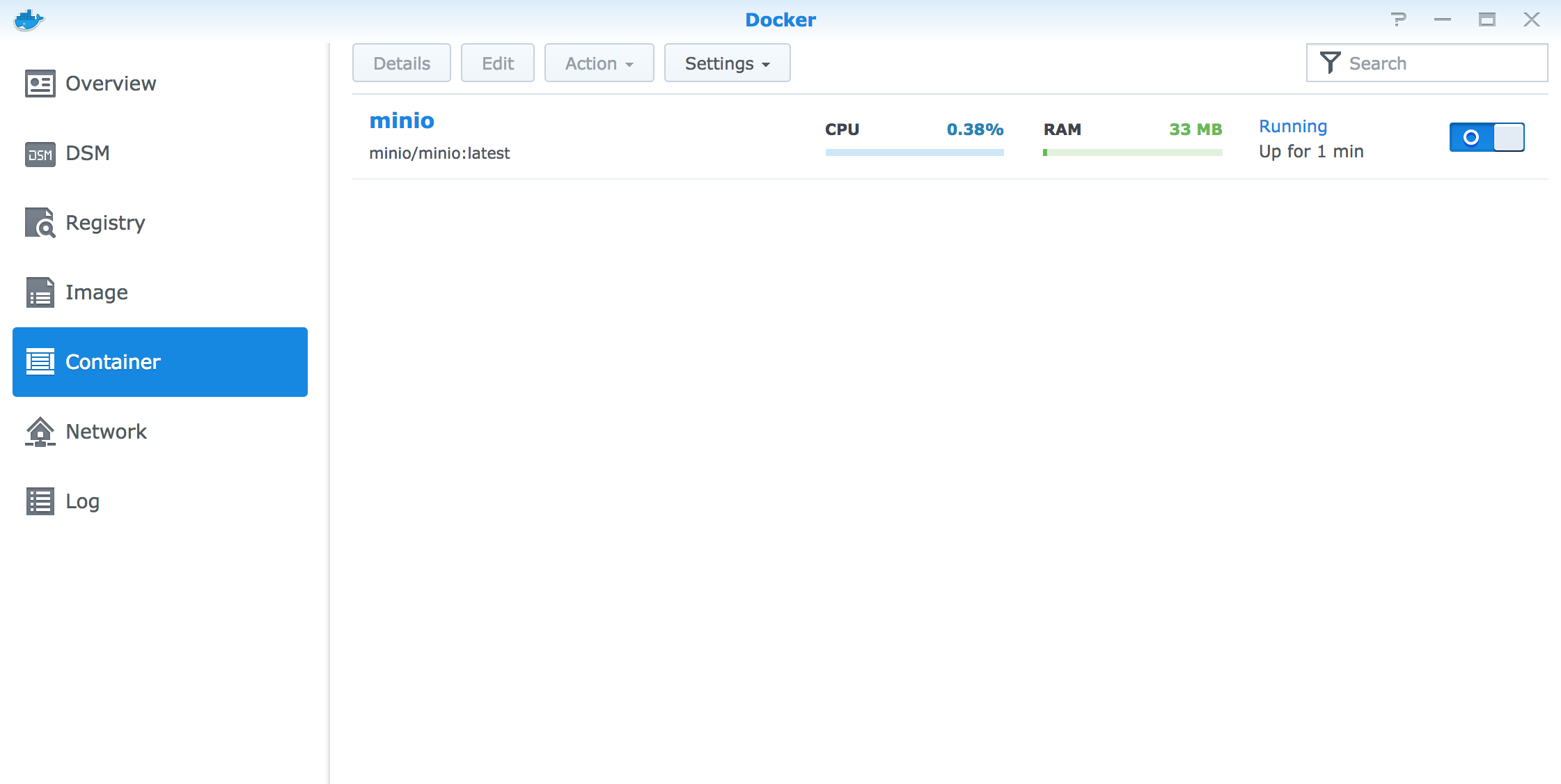Package CenterにMinioは用意されていないのですが、Docker経由でインストール可能です。sshでログインしてminioコマンドを直接実行してもいいですが、Docker経由の方がGUIベースで管理できて、Synology NAS的には楽です。