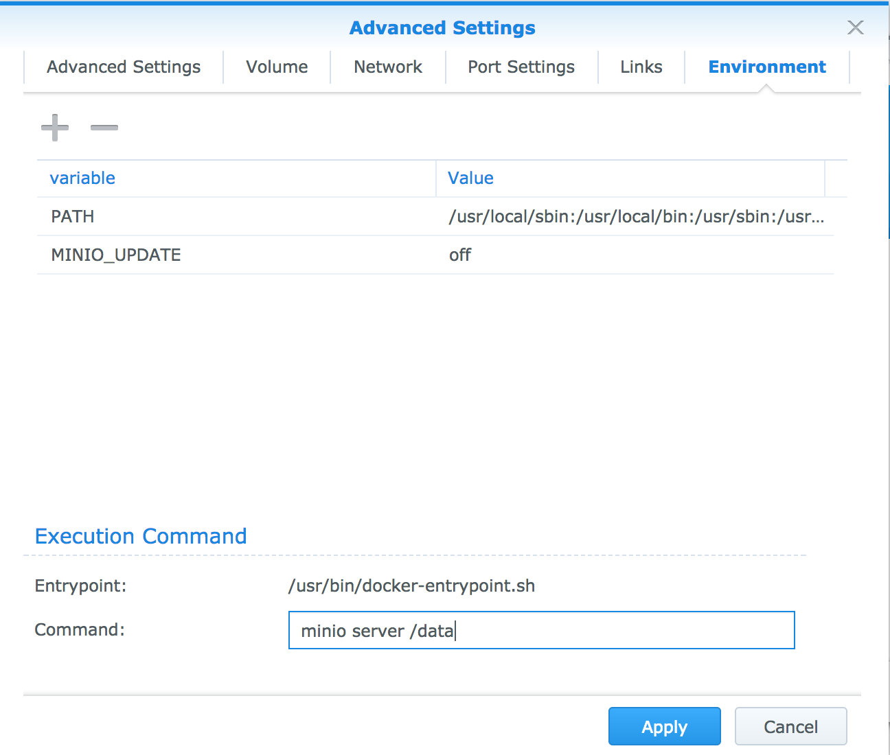 "Environment"タブをクリックし、"Command"にminio server /dataを入力。