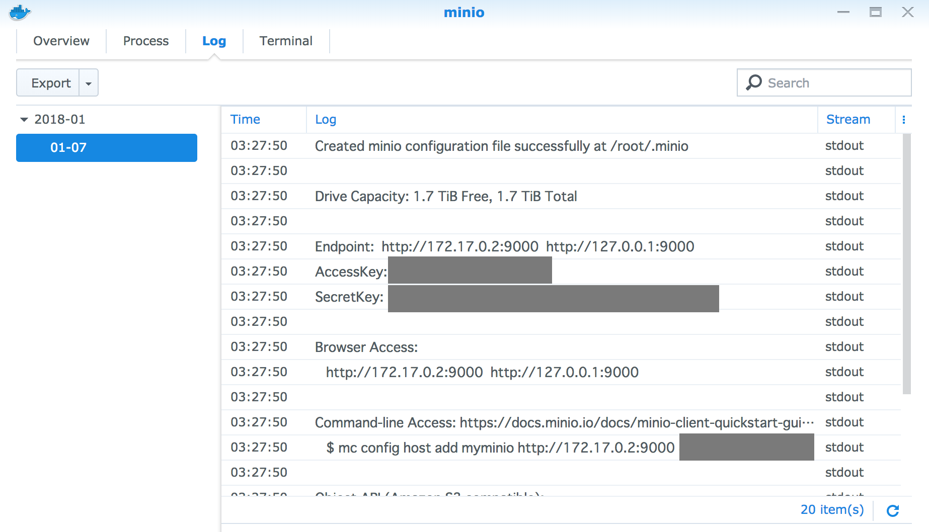 minioコンテナをクリックし、"Details"ボタンをクリック。"Log"タブを開くとAccessKeyとSecretKeyを確認できる。