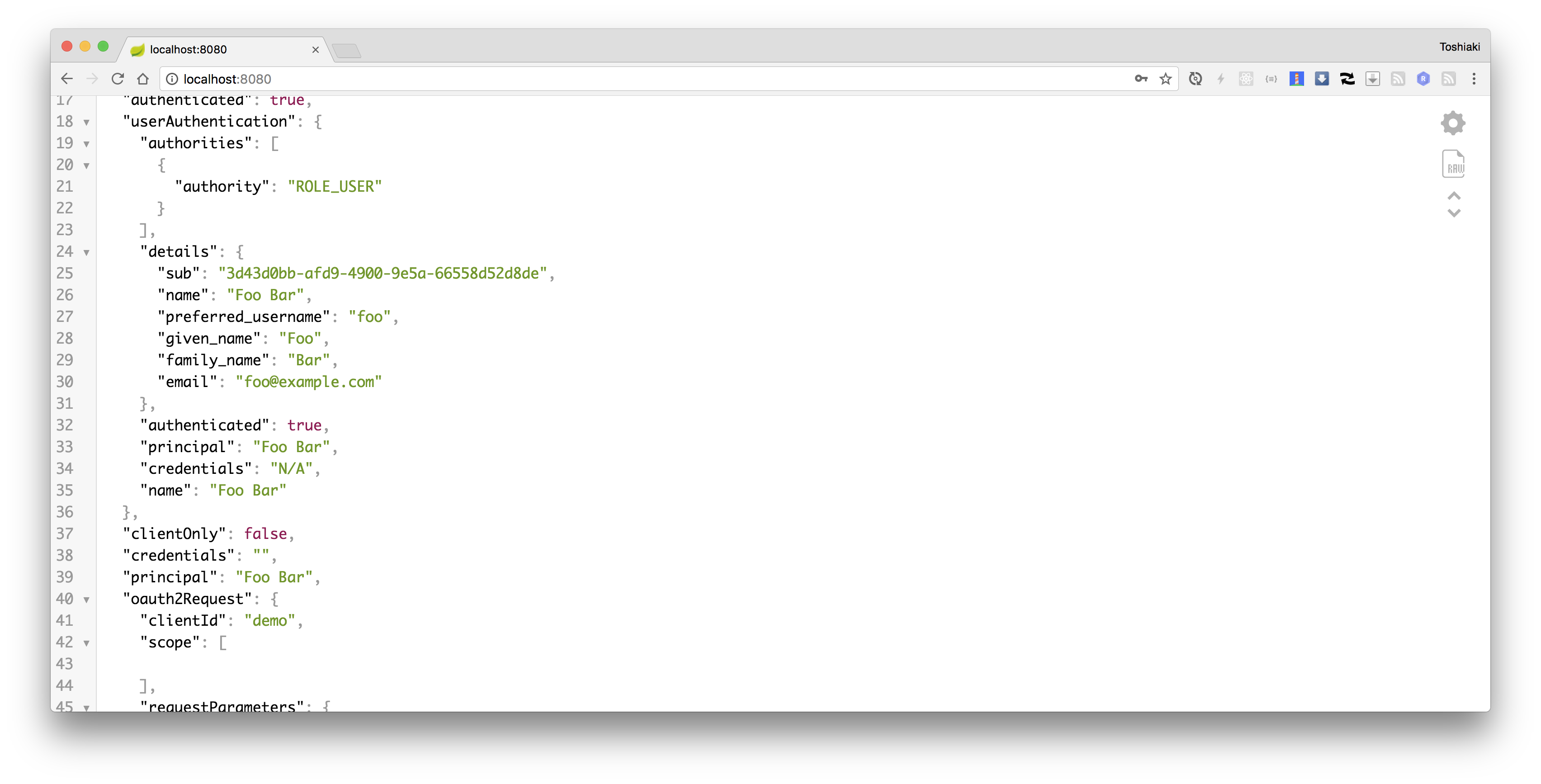 あとはControllerの引数にログインユーザー情報としてjava.security.Principalあるいはorg.springframework.security.core.Authenticationを取れるようになります。