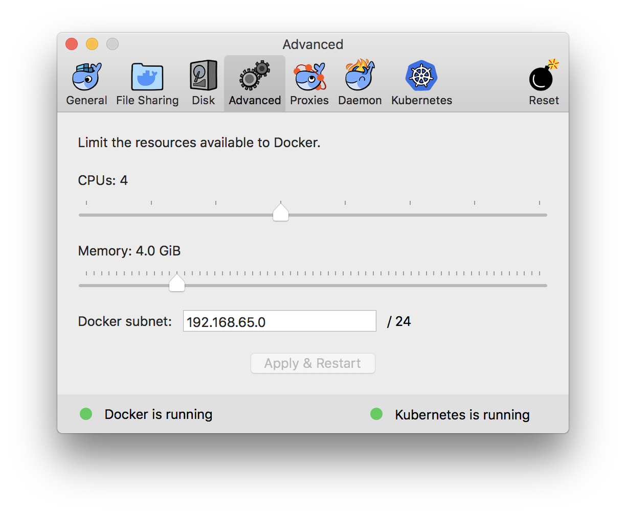 メモリを4GBにして、KubernetesタブでEnable Kubernetesにチェック。