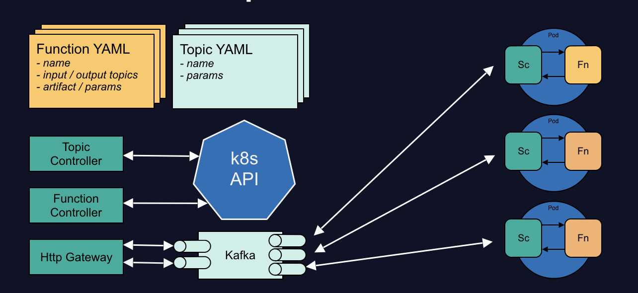 各種言語で関数コードを書き、Dockerイメージとしてパッケージングします。Functionリソースと入り口となるTopicリソースをk8sにデプロイします。